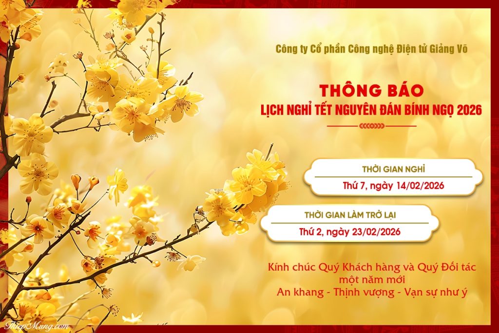 Kính gửi Quý Khách hàng / Quý Đối tác, Nhân dịp Tết Nguyên Đán Xuân Bính Ngọ 2026, Công ty Cổ phần Công nghệ Điện tử Giảng Võ xin trân trọng thông báo đến...